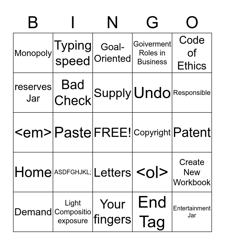 This bingo card has a free space and 24 words: ASDFGHJKL;, Light Compositio exposure, Supply, Demand, Code of Ethics, Monopoly, reserves Jar, Typing speed, Copyright, Letters, Undo, <em>, <ol>, Create New Workbook, Bad Check, End Tag, Patent, Goal-Oriented, Responsible, Paste, Entertainment Jar, Home, Goiverment Roles in Business and Your fingers.