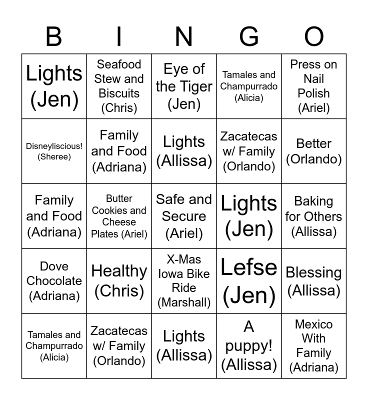 This bingo card has 55 words: Free!, Tamales and Champurrado (Alicia), Menorah and Treats (Ariel), Lights (Jen), Lights (Allissa), 2 Trees (Sheree), Family and Food (Adriana), Seafood Stew and Biscuits (Chris), Zacatecas w/ Family (Orlando), Muppets and Die Hard (Marshall), Tamales and Champurrado (Alicia), Disneyland (Alicia), Pan Dulce (Alicia), Driving to Mexico (Alicia), Accomplished (Alicia), Menorah and Treats (Ariel), Press on Nail Polish (Ariel), Butter Cookies and Cheese Plates (Ariel), Together with Family (Ariel), Safe and Secure (Ariel), Lights (Jen), Family Visit (Jen), Lefse (Jen), Eye of the Tiger (Jen), Normal (Jen), Lights (Allissa), A puppy! (Allissa), Cookies (Allissa), Baking for Others (Allissa), Blessing (Allissa), 2 Trees (Sheree), Disneyland (Sheree), Green Bean Casserole (Sheree), Christmas Morning (Sheree), Disneyliscious! (Sheree), Family and Food (Adriana), Glowforge (Adriana), Dove Chocolate (Adriana), Mexico With Family (Adriana), Successful (Adriana), Seafood Stew and Biscuits (Chris), Dodgers Tix and Air Miles (Chris), Apple Walnut Pancakes (Chris), Kid's Stockings (Chris), Healthy (Chris), Zacatecas w/ Family (Orlando), Health and Bose (Orlando), Apple Pie (Orlando), Mexico w/ Dad's Family (Orlando), Better (Orlando), Muppets and Die Hard (Marshall), An Organized Office (Marshall), Ginger Cookies (Marshall), X-Mas Iowa Bike Ride (Marshall) and Content (Marshall).