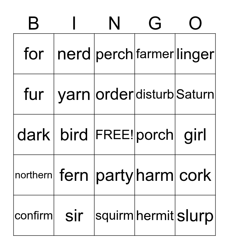 This bingo card has a free space and 24 words: fern, sir, order, confirm, linger, for, fur, nerd, porch, party, disturb, dark, harm, cork, yarn, hermit, girl, perch, Saturn, bird, slurp, northern, farmer and squirm.