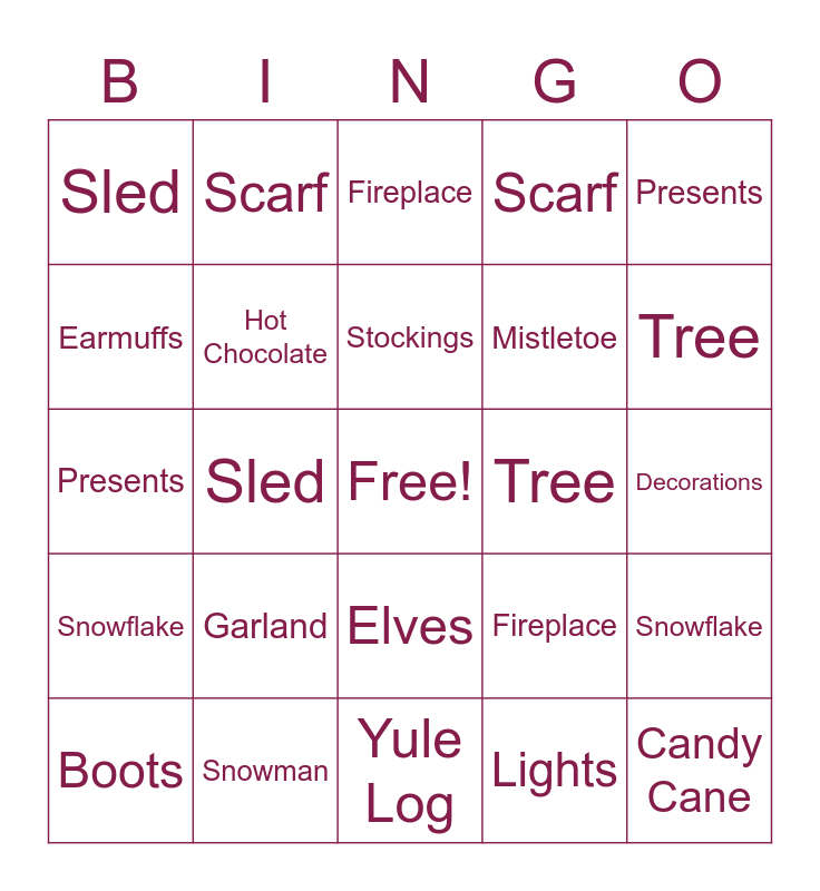 ⚠ This card has duplicate items: Ornament (2), Snowman (2), Jingle Bells (2), Snowflake (2), Ice Skates (2), Wreath (2), Hot Chocolate (2), Mistletoe (2), Decorations (2), Scarf (2), Gingerbread (2), Earmuffs (2), Garland (2), Gloves (2), Sled (2), Candy Cane (2), Presents (2), Reindeer (2), Stockings (2), Tree (2), Fireplace (2), Boots (2), Lights (2)