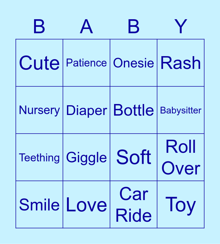 This bingo card has 22 words: Love, Happy, Patience, Baby, Diaper, Bottle, Cute, Onesie, Soft, Toy, Teething, Rash, Crying, Sleep, Car Ride, Fun, Roll Over, Smile, Giggle, Nursery, Babysitter and Parents.