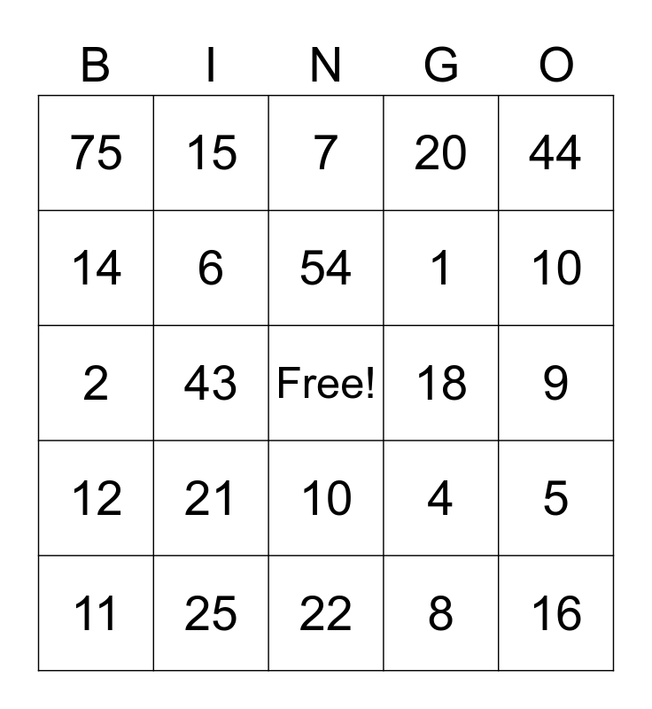 This bingo card has a free space and 24 words: 21, 25, 54, 11, 44, 75, 14, 15, 18, 10, 1, 2, 4, 5, 6, 8, 9, 7, 10, 43, 16, 12, 20 and 22.