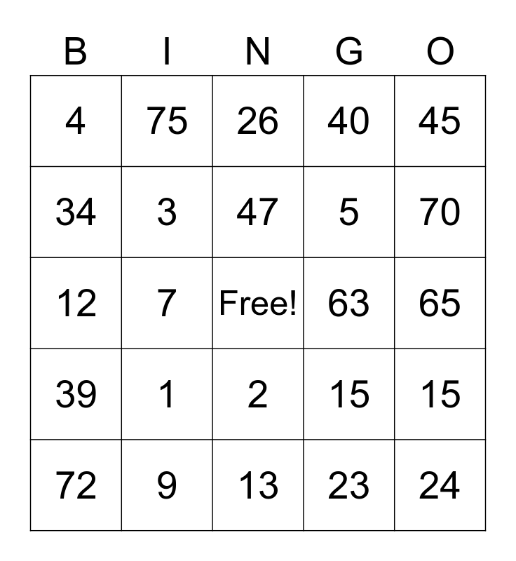 This bingo card has a free space and 24 words: 1, 9, 47, 72, 45, 4, 34, 75, 63, 2, 5, 12, 15, 15, 3, 23, 65, 26, 70, 7, 24, 39, 40 and 13.