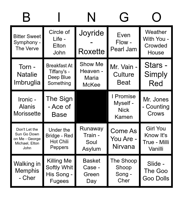 This bingo card has a free space and 34 words: I Alone - Live, The Shoop Shoop Song - Cher, Love Is All Around - Wet Wet Wet, Nothing Compares 2 U - Sinéad O'Connor, Don't Let the Sun Go Down on Me - George Michael, Elton John, Breakfast At Tiffany's - Deep Blue Something, Weather With You - Crowded House, Walking in Memphis - Cher, Circle of Life - Elton John, No Matter What - Boyzone, Show Me Heaven - Maria McKee, Joyride - Roxette, Back for Good - Take That, Believe - Cher, I Promise Myself - Nick Kamen, Stars - Simply Red, Killing Me Softly Whit His Song - Fugees, Ironic - Alanis Morissette, Under the Bridge - Red Hot Chili Peppers, Come As You Are - Nirvana, Runaway Train - Soul Asylum, Don't Look Back in Anger - Oasis, Bitter Sweet Symphony - The Verve, Mr. Jones - Counting Crows, Basket Case - Green Day, Slide - The Goo Goo Dolls, Even Flow - Pearl Jam, It's My Life - Dr. Alban, Mr. Vain - Culture Beat, Torn - Natalie Imbruglia, Gangsta's Paradise - Coolio, The Sign - Ace of Base, Girl You Know It's True - Milli Vanilli and Ghetto Supastar - Pras Michel.