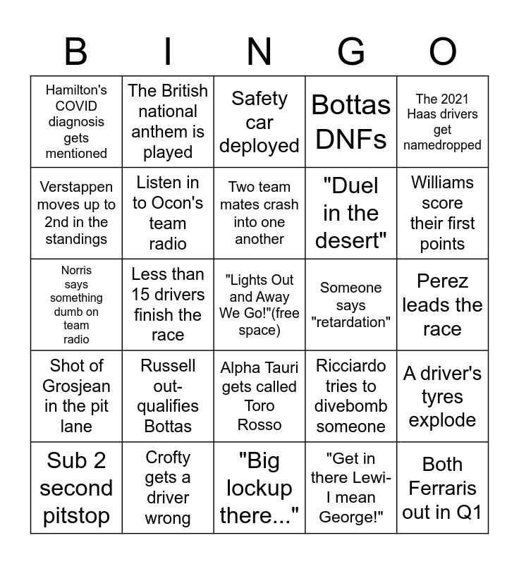 This bingo card has a free space and 24 words: Russell out-qualifies Bottas, Crofty gets a driver wrong, Two team mates crash into one another, Sub 2 second pitstop, The 2021 Haas drivers get namedropped, Hamilton's COVID diagnosis gets mentioned, Verstappen moves up to 2nd in the standings, The British national anthem is played, Someone says "retardation", Alpha Tauri gets called Toro Rosso, "Duel in the desert", Norris says something dumb on team radio, Ricciardo tries to divebomb someone, A driver's tyres explode, Listen in to Ocon's team radio, "Get in there Lewi-I mean George!", Perez leads the race, Safety car deployed, Williams score their first points, Less than 15 drivers finish the race, Both Ferraris out in Q1, Shot of Grosjean in the pit lane, Bottas DNFs and "Big lockup there...".