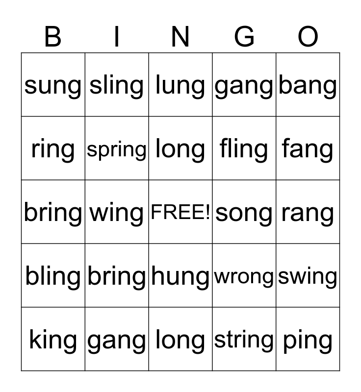 This bingo card has a free space and 24 words: bring, gang, long, king, bang, sung, ring, sling, song, hung, fling, bring, wrong, swing, spring, string, rang, lung, fang, wing, ping, bling, gang and long.