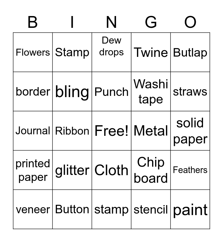 This bingo card has a free space and 24 words: glitter, Button, Punch, veneer, Butlap, Flowers, border, Stamp, Metal, Cloth, Washi tape, Journal, Chip board, Feathers, bling, stencil, solid paper, Dew drops, straws, Ribbon, paint, printed paper, Twine and stamp.