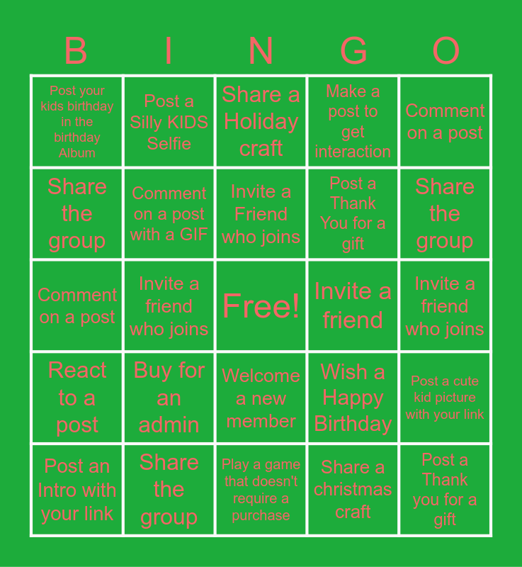 This bingo card has a free space and 24 words: Buy for an admin, Share the group, Invite a Friend who joins, Post an Intro with your link, Comment on a post, Post your kids birthday in the birthday Album, Share the group, Post a Silly KIDS Selfie, Invite a friend, Welcome a new member, Post a Thank You for a gift, Comment on a post, Wish a Happy Birthday, Post a cute kid picture with your link, Comment on a post with a GIF, Share a christmas craft, Invite a friend who joins, Share a Holiday craft, Share the group, Invite a friend who joins, Post a Thank you for a gift, React to a post, Make a post to get interaction and Play a game that doesn't require a purchase.