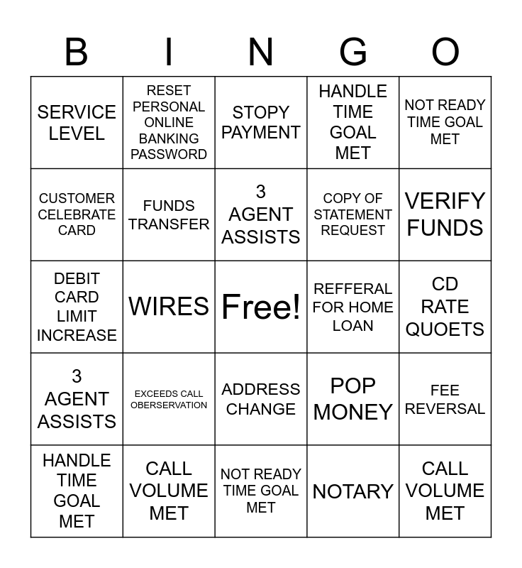 This bingo card has a free space and 24 words: EXCEEDS CALL OBERSERVATION, CALL VOLUME MET, 3 AGENT ASSISTS, HANDLE TIME GOAL MET, NOT READY TIME GOAL MET, SERVICE LEVEL, CUSTOMER CELEBRATE CARD, RESET PERSONAL ONLINE BANKING PASSWORD, REFFERAL FOR HOME LOAN, ADDRESS CHANGE, COPY OF STATEMENT REQUEST, DEBIT CARD LIMIT INCREASE, POP MONEY, FEE REVERSAL, FUNDS TRANSFER, NOTARY, CD RATE QUOETS, STOPY PAYMENT, VERIFY FUNDS, WIRES, CALL VOLUME MET, 3 AGENT ASSISTS, HANDLE TIME GOAL MET and NOT READY TIME GOAL MET.