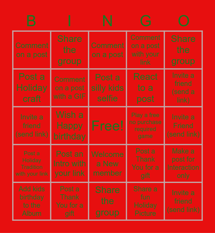 This bingo card has a free space and 24 words: Post an Intro with your link, Post a Thank You for a gift, Post a silly kids selfie, Add kids birthday to the Album, Share the group, Comment on a post, Post a Holiday craft, Share the group, Play a free no purchase required game, Welcome a New member, React to a post, Invite a friend (send link), Post a Thank You for a gift, Make a post for Interaction only, Comment on a post with a GIF, Share a fun Holiday Picture, Invite a Friend (send link), Comment on a post, Invite a friend (send a link), Wish a Happy birthday, Invite a friend (send link), Post a Holiday Tradition with your link, Comment on a post with your link and Share the group.