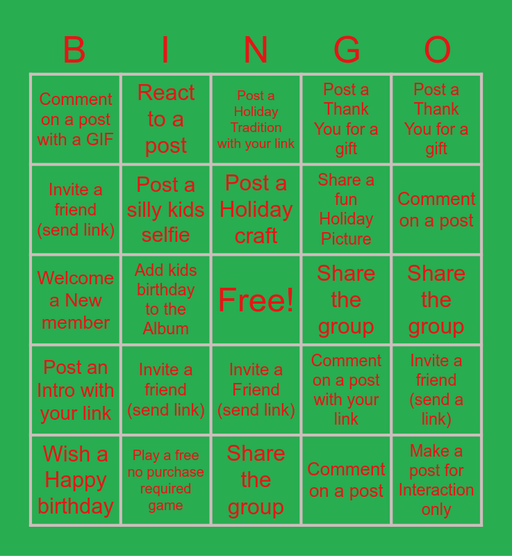 This bingo card has a free space and 24 words: Invite a friend (send link), Play a free no purchase required game, Post a Holiday craft, Wish a Happy birthday, Post a Thank You for a gift, Comment on a post with a GIF, Invite a friend (send link), React to a post, Share the group, Invite a Friend (send link), Share a fun Holiday Picture, Welcome a New member, Comment on a post with your link, Invite a friend (send a link), Post a silly kids selfie, Comment on a post, Share the group, Post a Holiday Tradition with your link, Comment on a post, Add kids birthday to the Album, Make a post for Interaction only, Post an Intro with your link, Post a Thank You for a gift and Share the group.