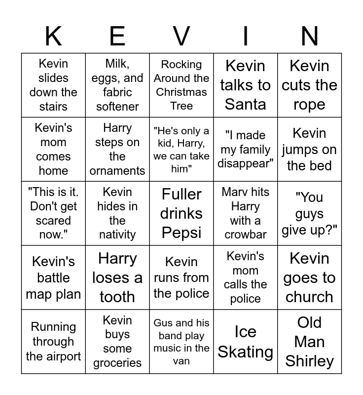 This bingo card has 30 words: Kevin buys some groceries, Marv gets a spider on his face, Kevin hides in the nativity, "Keep the change ya filthy animal", Kevin slides down the stairs, Rocking Around the Christmas Tree, Harry steps on the ornaments, Kevin runs from the police, Marv hits Harry with a crowbar, Gus and his band play music in the van, "You guys give up?", Fuller drinks Pepsi, Ice Skating, Old Man Shirley, Kevin jumps on the bed, Kevin eats dinner, Kevin's mom calls the police, Kevin's battle map plan, Harry loses a tooth, Kevin cuts the rope, "This is it. Don't get scared now.", Bandits get bonked with paint cans, Milk, eggs, and fabric softener, "I made my family disappear", Kevin's mom comes home, Kevin talks to Santa, Kevin goes to church, Running through the airport, "He's only a kid, Harry, we can take him" and Harry burns his hand.