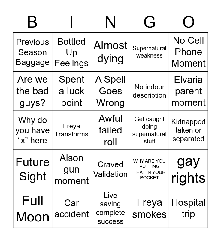 This bingo card has a free space and 29 words: Full Moon, Minerva sets something on fire, Freya Transforms, Backstory Trauma!, Previous Season Baggage, Almost dying, Spent a luck point, Alson gun moment, Get caught doing supernatural stuff, Car accident, Kidnapped taken or separated, Hospital trip, Live saving complete success, Freya smokes, Elvaria parent moment, Liam accidentally swears as Alson, Craved Validation, Future Sight, No Cell Phone Moment, Why do you have “x” here, WHY ARE YOU PUTTING THAT IN YOUR POCKET, Going off notes, No indoor description, Are we the bad guys?, Supernatural weakness, Bottled Up Feelings, gay rights, A Spell Goes Wrong and Someone cries laughing.