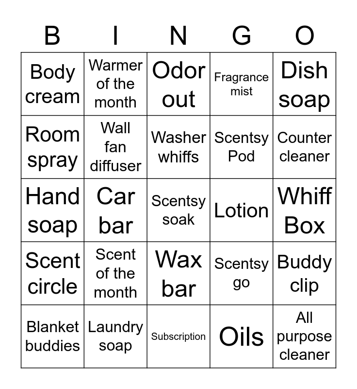 This bingo card has 35 words: Scentsy Buddy, Scentsy System, Mini warmer, Wall fan diffuser, Wax bar, Fragrance mist, Room spray, Scentsy soft, Washer whiffs, Body wash, Hand soap, Dish soap, Free!, Hand cream, Body cream, Lotion, Oils, Car bar, Scent circle, Scentsy soak, Scentsy go, Blanket buddies, Buddy clip, Laundry soap, Odor out, Counter cleaner, All purpose cleaner, Bathroom cleaner, Scentsy Pod, Whiff Box, Laundry Love, Subscription, Scent of the month, Warmer of the month and Kids.