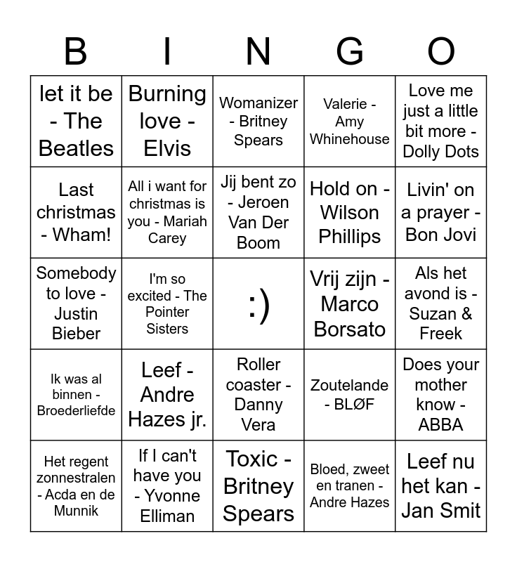 This bingo card has a free space and 53 words: Hello - Adele, Leef nu het kan - Jan Smit, Kijk omhoog - Nick en Simon, Bloed, zweet en tranen - Andre Hazes, Leef - Andre Hazes jr., Bloemkôle - Oôs Joôs, Burning love - Elvis, Piano man - Billy Joel, Last christmas - Wham!, Underneath the tree - Kelly Clarkson, All i want for christmas is you - Mariah Carey, Oya Lele - K3, Does your mother know - ABBA, Zoutelande - BLØF, Het werd zomer - Rob de Nijs, Het regent zonnestralen - Acda en de Munnik, Jij bent zo - Jeroen Van Der Boom, Vrij zijn - Marco Borsato, Zij weet het - Tino Martin, Love me just a little bit more - Dolly Dots, I'm so excited - The Pointer Sisters, Paradise by the dashboardlight - Meat Loaf, Hold on - Wilson Phillips, let it be - The Beatles, How will i know - Whitney Houston, If I can't have you - Yvonne Elliman, Billie Jean - Michael Jackson, Smooth criminal - Michael Jackson, Do they know it's christmas? - Band Aid, Livin' on a prayer - Bon Jovi, I will survive - Gloria Gaynor, I kissed a girl - Katy Perry, Hot N cold - Katy Perry, Run the world - Beyonce, River deep Mountain high - Ike & Tina Turner, Dancing Queen - ABBA, Valerie - Amy Whinehouse, Toxic - Britney Spears, Womanizer - Britney Spears, Don't stop believing - Journey, Hotel California - Eagles, Jolene - Dolly Parton, Als het avond is - Suzan & Freek, Duurt te lang - Davina Michelle, Más Más Más - Rolf Sanchez, Roller coaster - Danny Vera, Santa tell me - Ariana Grande, Don't start now - Dua Lipa, Somebody to love - Justin Bieber, Ik was al binnen - Broederliefde, Jungle - Broederliefde, Daddy Cool - Boney M. and Walking on sunshine - Katrina & The Waves.
