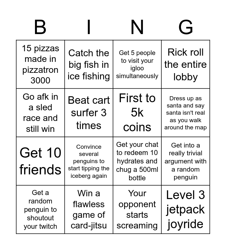 This bingo card has 17 words: Get a random penguin to shoutout your twitch, Win a flawless game of card-jitsu, Get 5 people to visit your igloo simultaneously, Rick roll the entire lobby, Get 10 friends, Beat cart surfer 3 times, Get your chat to redeem 10 hydrates and chug a 500ml bottle, Dress up as santa and say santa isn't real as you walk around the map, Go afk in a sled race and still win, Convince several penguins to start tipping the iceberg again, Your opponent starts screaming, Get into a really trivial argument with a random penguin, 15 pizzas made in pizzatron 3000, Catch the big fish in ice fishing, First to 5k coins, Level 3 jetpack joyride and Auto win: Your opponent gets banned or kicked.