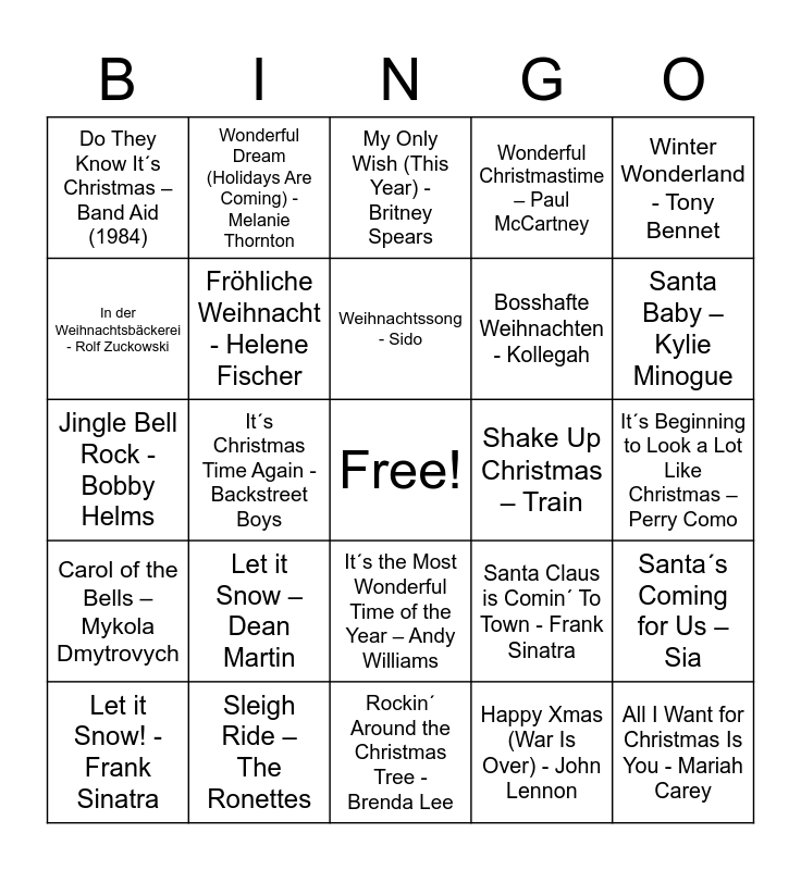 This bingo card has a free space and 44 words: Driving Home for Christmas – Chris Rea, All I Want for Christmas Is You - Mariah Carey, White Christmas - Bing Crosby, Let it Snow! - Frank Sinatra, Feliz Navidad - Jose Feliciano, Happy Xmas (War Is Over) - John Lennon, My Only Wish (This Year) - Britney Spears, Mary´s Boy Child – Boney M., Winter Wonderland - Tony Bennet, Sleigh Ride – The Ronettes, Wonderful Christmastime – Paul McCartney, Shake Up Christmas – Train, It´s the Most Wonderful Time of the Year – Andy Williams, Let it Snow – Dean Martin, Merry XMas Everybody - Slade, Rockin´ Around the Christmas Tree - Brenda Lee, I Wish It Could Be Christmas Everyday – Wizzard, Jingle Bell Rock - Bobby Helms, Mistletoe - Justin Bieber, Santa Baby – Kylie Minogue, Wonderful Dream (Holidays Are Coming) - Melanie Thornton, Thank God It´s Christmas - Queen, Merry Christmas Everyone - Shakin´Stevens, Do They Know It´s Christmas – Band Aid (1984), Christmas Time – Bryan Adams, It´s Beginning to Look a Lot Like Christmas – Perry Como, Shake Up Christmas 2011 – Natasha Bedingfield, In der Weihnachtsbäckerei - Rolf Zuckowski, Santa Claus is Comin´ To Town - Frank Sinatra, Carol of the Bells – Mykola Dmytrovych, Christmas (Baby Please Come Home) - Mariah Carey, Santa´s Coming for Us – Sia, Frosty The Snowman - The Beach Boys, Drei Haselnüsse für Aschenbrödel (Motiv 1) - Karel Svoboda, It´s Christmas Time Again - Backstreet Boys, Winter Wonderland – Michael Bublé, Last Christmas - Wham!, Es ist für uns eine Zeit angekommen - Rolf Zuckowski, Weihnachtssong - Sido, In der Weihnachtsbäckerei - Rolf Zuckowski, Bosshafte Weihnachten - Kollegah, Letzte Weihancht - Vanessa Mai, Fröhliche Weihnacht - Helene Fischer and Rudolph the Red-Nosed Reindeer.