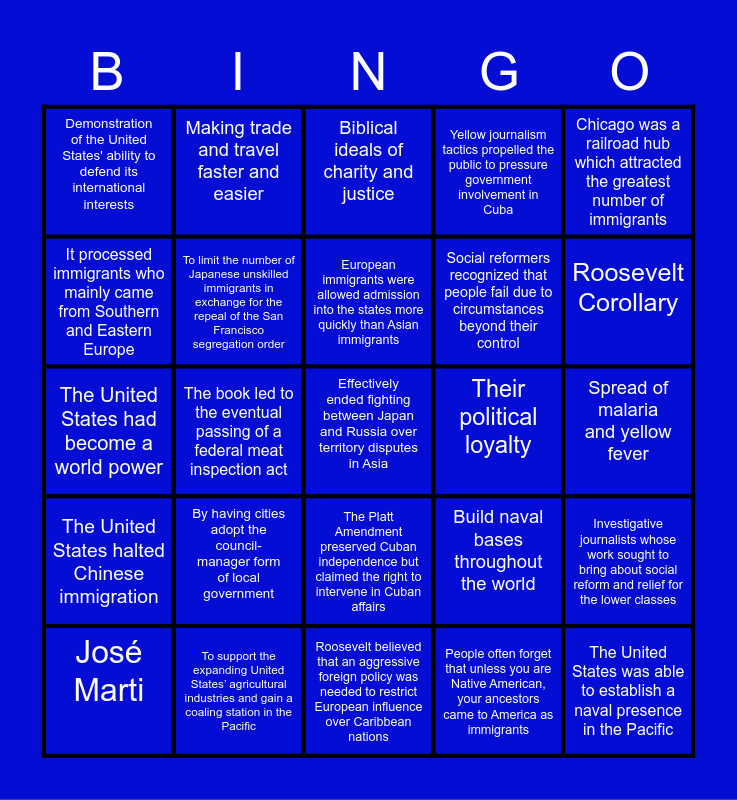 This bingo card has a free space and 24 words: By having cities adopt the council-manager form of local government, To support the expanding United States’ agricultural industries and gain a coaling station in the Pacific, European immigrants were allowed admission into the states more quickly than Asian immigrants, José Marti, Chicago was a railroad hub which attracted the greatest number of immigrants, Demonstration of the United States' ability to defend its international interests, It processed immigrants who mainly came from Southern and Eastern Europe, Making trade and travel faster and easier, Their political loyalty, The Platt Amendment preserved Cuban independence but claimed the right to intervene in Cuban affairs, Social reformers recognized that people fail due to circumstances beyond their control, The United States had become a world power, Build naval bases throughout the world, Investigative journalists whose work sought to bring about social reform and relief for the lower classes, To limit the number of Japanese unskilled immigrants in exchange for the repeal of the San Francisco segregation order, People often forget that unless you are Native American, your ancestors came to America as immigrants, Spread of malaria and yellow fever, Biblical ideals of charity and justice, Roosevelt Corollary, The book led to the eventual passing of a federal meat inspection act, The United States was able to establish a naval presence in the Pacific, The United States halted Chinese immigration, Yellow journalism tactics propelled the public to pressure government involvement in Cuba and Roosevelt believed that an aggressive foreign policy was needed to restrict European influence over Caribbean nations.