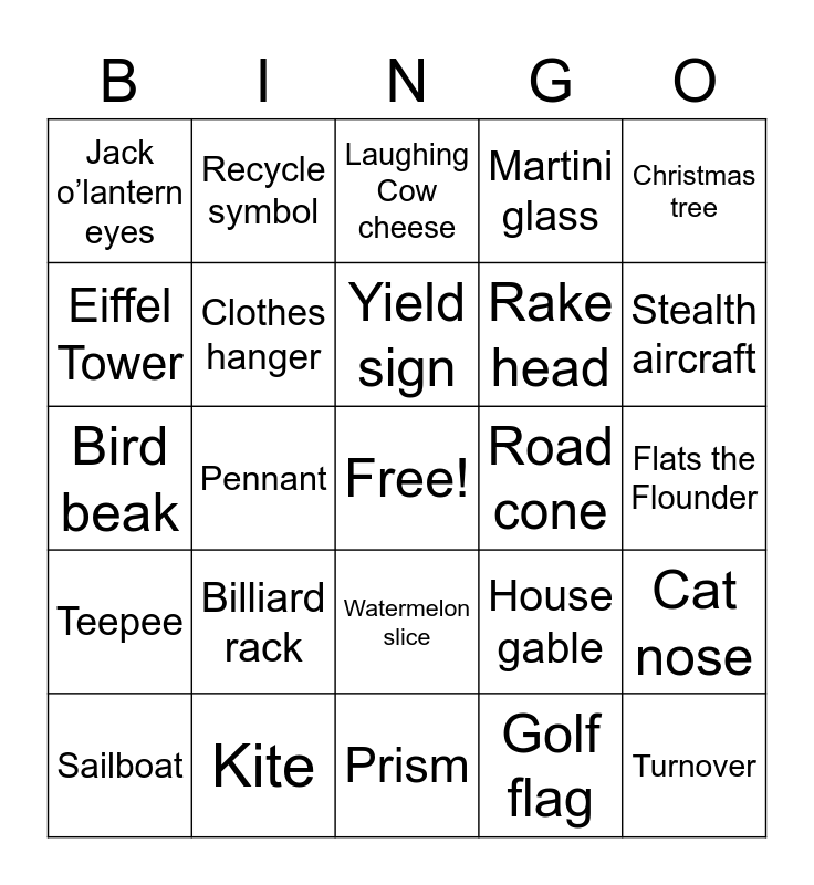 This bingo card has a free space and 39 words: Pizza slice, Pyramid, Toblerone chocolate, Clothes hanger, Sailboat, Watermelon slice, Yield sign, Corn chip, Christmas tree, Teepee, Pennant, Martini glass, Turnover, Flats the Flounder, Road cone, Billiard rack, Food pyramid, Jack o’lantern eyes, Tent, House gable, Eiffel Tower, Prism, Rake head, Stealth aircraft, Ice cream cone, Pie slice, Mountain, Samosa, Half sandwich, Recycle symbol, Pita chips, Mayan temple, Laughing Cow cheese, Kite, Golf flag, Candy corn, Cat nose, Bird beak and UFO.