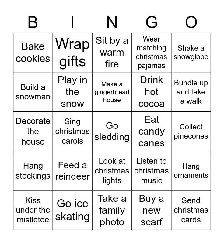 This bingo card has a free space and 24 words: Feed a reindeer, Go ice skating, Make a gingerbread house, Kiss under the mistletoe, Shake a snowglobe, Bake cookies, Build a snowman, Wrap gifts, Eat candy canes, Look at christmas lights, Drink hot cocoa, Decorate the house, Listen to christmas music, Hang ornaments, Play in the snow, Buy a new scarf, Collect pinecones, Sit by a warm fire, Bundle up and take a walk, Sing christmas carols, Send christmas cards, Hang stockings, Wear matching christmas pajamas and Take a family photo.