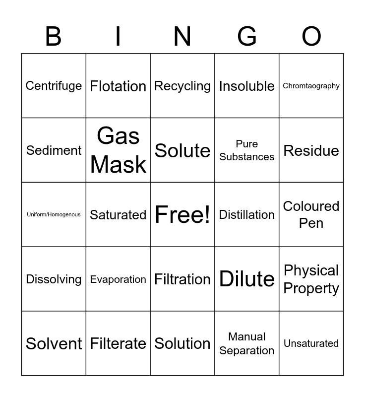This bingo card has a free space and 25 words: Evaporation, Solution, Solute, Solvent, Chromtaography, Centrifuge, Sediment, Flotation, Distillation, Filtration, Pure Substances, Uniform/Homogenous, Dilute, Physical Property, Gas Mask, Oil Production, Coloured Pen, Recycling, Residue, Saturated, Unsaturated, Filterate, Dissolving, Insoluble and Manual Separation.