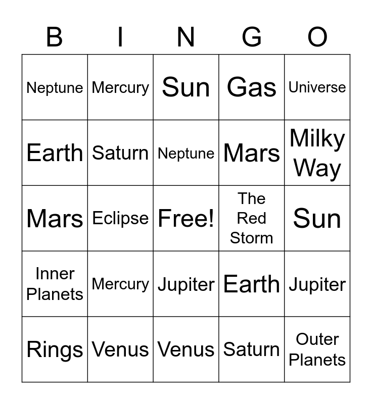 This bingo card has a free space and 24 words: Mercury, Venus, Neptune, Rings, Universe, Neptune, Earth, Mercury, The Red Storm, Jupiter, Mars, Mars, Earth, Jupiter, Saturn, Saturn, Sun, Sun, Milky Way, Eclipse, Outer Planets, Inner Planets, Gas and Venus.