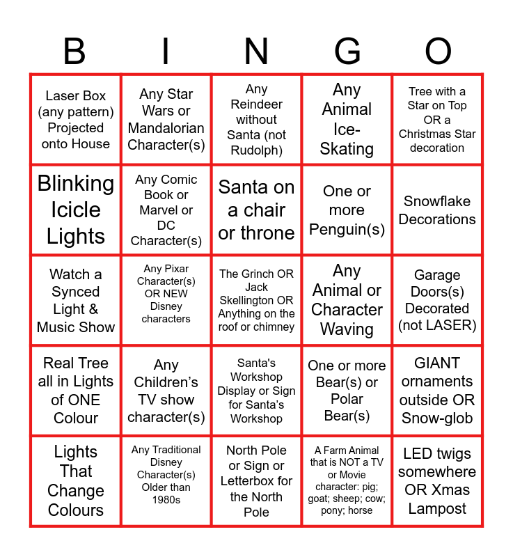 This bingo card has 55 words: All Lights on House in ONE colour, Any Pixar Character(s) OR NEW Disney characters, Santa on a DIFFERENT vehicle (no sleigh) ex: motorcycle, Any Animal Ice-Skating, Candy Canes or light bulbs on stakes lining the driveway or walk, Entry-light Bulbs Changed to Christmas Colours, Any Comic Book or Marvel or DC Character(s), Santa with Sleigh, Any Animal or Character Waving, Festivus Pole OR non-Xmas decoration like a Palm Tree, Blinking Icicle Lights, Snoopy or Any Peanuts Gang Character(s), Santa's Workshop Display or Sign for Santa’s Workshop, Deer or Moose of Frame & Lights, Angel(s) OR Traditional Nativity Set, Traditional Red-and-Green Lighting on house or tree, Any Star Wars or Mandalorian Character(s), Any Reindeer without Santa (not Rudolph), Hippo or Dino or Llama, Garage Doors(s) Decorated (not LASER), Lights That Change Colours, Any Traditional Disney Character(s) Older than 1980s, The Grinch OR Jack Skellington OR Anything on the roof or chimney, One or more Penguin(s), Garland or Wreath(s) or Bow(s) Hung Outside, Watch a Synced Light & Music Show, Any Children’s TV show character(s), Moving Reindeer or Santa (inside or outside), One or more Bear(s) or Polar Bear(s), LED twigs somewhere OR Xmas Lampost, Rope lights on house or deck or fence, Any XLG (2m+) inflated character, Rudolph or Abominable Snowman or Hermie, Woodland Creature(s) - NOT deer or moose or bird, Tree with a Star on Top OR a Christmas Star decoration, Real Tree all in Lights of ONE Colour, Collection of inflated characters (3+), Santa on a chair or throne, Fantastical Creatures: Unicorn or Dragon or Pokemon, Airplane OR helicopter OR Choo-choo Train, Laser Box (any pattern) Projected onto House, Collection of Snowpersons (3+), Elf/elves or gnome(s), One or more Birds (goose, duck, owl, dove, etc.), GIANT ornaments outside OR Snow-glob, Words written in Lights OR Candle(s), Lone Snowperson (any type), North Pole or Sign or Letterbox for the North Pole, A Dog or a Cat that is NOT a TV or Movie character, Snowflake Decorations, Purple or Pink Lights used somewhere, A Soldier or Nutcracker, Tropical or DJ Santa, A Farm Animal that is NOT a TV or Movie character: pig; goat; sheep; cow; pony; horse and Wrapped/Lit Gift Box(es).