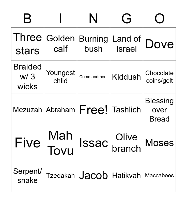 This bingo card has a free space and 32 words: Hatikvah, Miriam, Abraham, Esau, Five, Youngest child, Dove, Moses, Golden calf, 40 days and 40 nights, Commandment, Burning bush, The Ark, Tzitzit, Tashlich, Tu B'Shevat, Serpent/ snake, Mezuzah, Issac, Mah Tovu, Olive branch, Shalom, Blessing over Bread, Tzedakah, Maccabees, Land of Israel, Kiddush, Braided w/ 3 wicks, Three stars, Jacob, Leah and Chocolate coins/gelt.