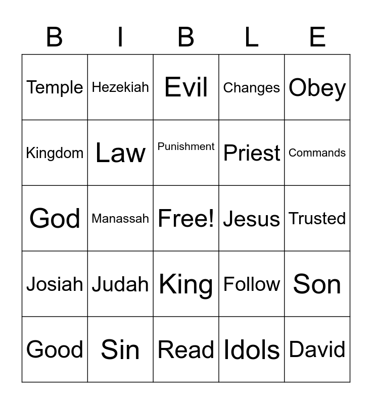 This bingo card has a free space and 24 words: Judah, Sin, Punishment, Good, Obey, Temple, Kingdom, Hezekiah, Jesus, King, Priest, God, Follow, Son, Law, Idols, Trusted, Evil, Commands, Manassah, David, Josiah, Changes and Read.
