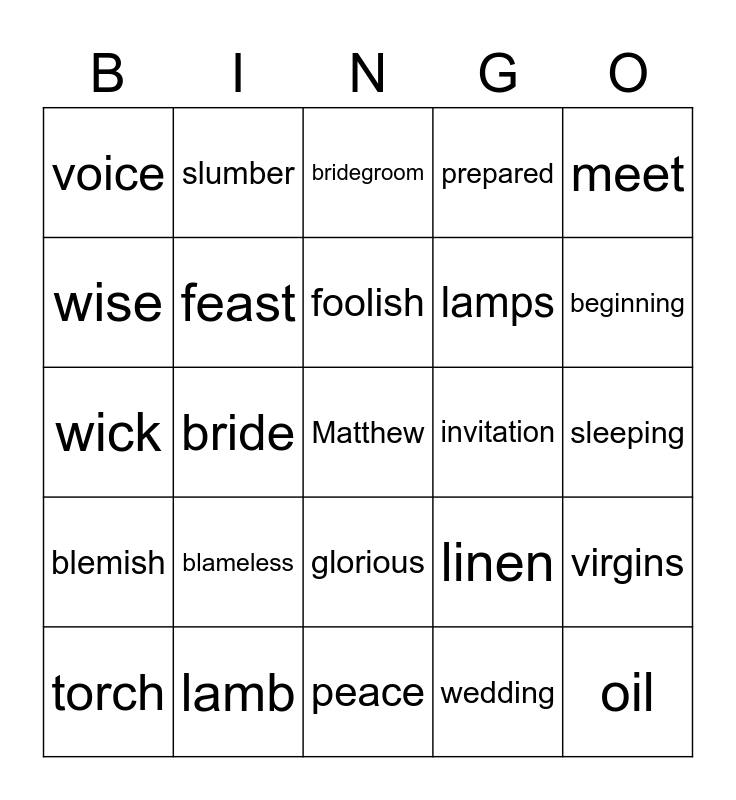 This bingo card has a free space and 32 words: wedding, wait, bride, procession, blemish, feast, meet, virgins, slumber, ready, foolish, bridegroom, watch, thief, invitation, marriage, torch, wick, glorious, blameless, linen, righteous, sleeping, lamb, oil, prepared, lamps, wise, voice, peace, Jesus and beginning.