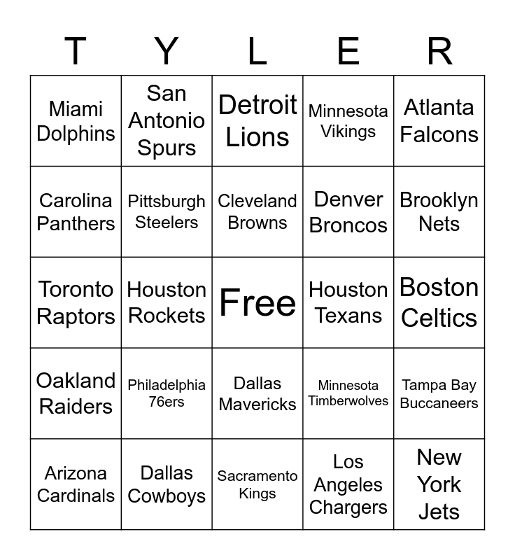 This bingo card has a free space and 62 words: New England Partiots, Dallas Cowboys, Philadelphia Eagles, Oakland Raiders, New York Giants, Seattle Seahawks, Pittsburgh Steelers, Green Bay Packers, Denver Broncos, San Francisco 49ers, Minnesota Vikings, Chicago Bears, Carolina Panthers, Los Angeles Rams, Washington Redskins, Miami Dolphins, New York Jets, Atlanta Falcons, Baltimore Ravens, Cleveland Browns, Houston Texans, Detroit Lions, Arizona Cardinals, Los Angeles Chargers, Buffalo Bills, New Orleans Saints, Jacksonville Jaguars, Cincinnati Bengals, Tampa Bay Buccaneers, Indianapolis Colts, Tennessee Titans, Cleveland Cavaliers, Golden State Warriors, Los Angeles Lakers, Boston Celtics, San Antonio Spurs, Oklahoma City Thunder, New York Knicks, Houston Rockets, Chicago Bulls, Toronto Raptors, Miami Heat, Philadelphia 76ers, Los Angeles Clippers, Brooklyn Nets, Minnesota Timberwolves, Milwaukee Bucks, New Orleans Pelicans, Phoenix Suns, Portland Trail Blazers, Dallas Mavericks, Sacramento Kings, Detroit Pistons, Washington Wizards, Utah Jazz, Indiana Pacers, Atlanta Hawks, Memphis Grizzlies, Denver Nuggets, Orlando Magic, Charlotte Hornets and Kansas City Chiefs.