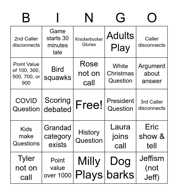 This bingo card has a free space and 24 words: Grandad category exists, Point value over 1000, Rose not on call, Tyler not on call, Caller disconnects, 2nd Caller disconnects, Point Value of 100, 300, 500, 700, or 900, Game starts 30 minutes late, President Question, History Question, White Christmas Question, COVID Question, Laura joins call, Eric show & tell, Bird squawks, Dog barks, 3rd Caller disconnects, Knickerbocker Glories, Argument about answer, Scoring debated, Jeffism (not Jeff), Kids make Questions, Adults Play and Milly Plays.