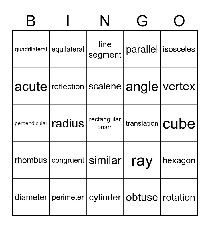 This bingo card has 30 words: perimeter, circumference, radius, right, quadrilateral, line segment, reflection, similar, translation, cylinder, cube, rectangular prism, obtuse, rotation, vertex, area, ray, rhombus, congruent, isosceles, perpendicular, trapezoid, equilateral, angle, acute, parallel, hexagon, diameter, scalene and octagon.
