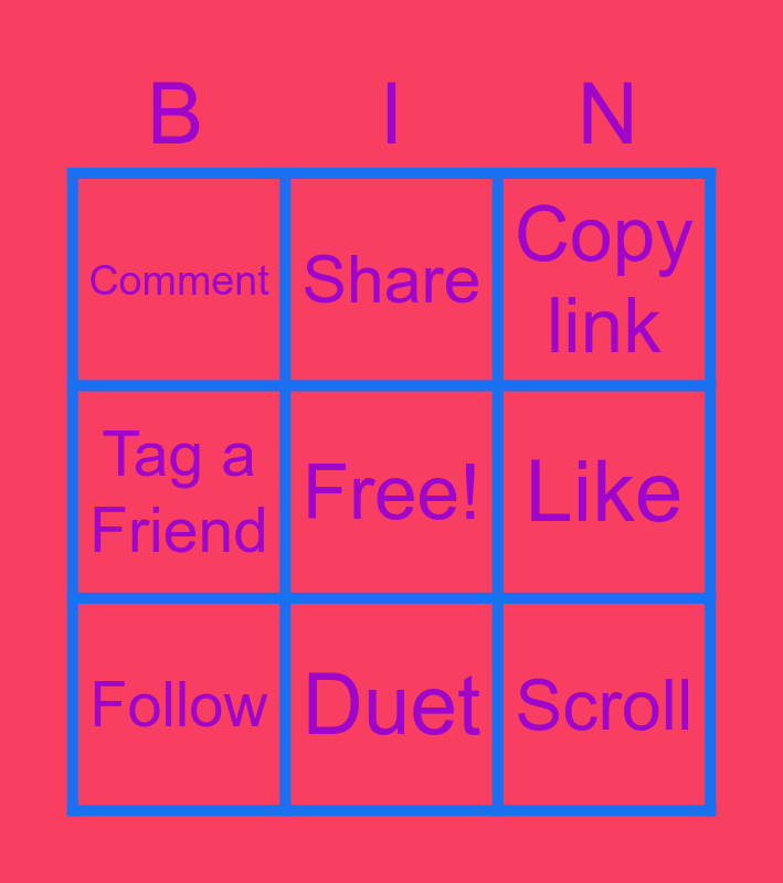 This bingo card has a free space and 8 words: Like, Copy link, Share, Follow, Comment, Scroll, Tag a Friend and Duet.