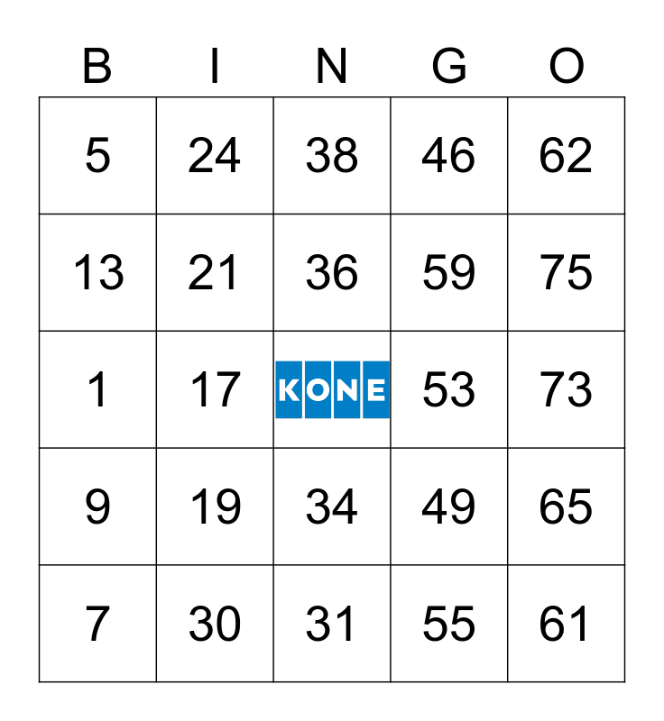 This bingo card has a free space and 24 words: 7, 19, 36, 55, 62, 5, 24, 38, 53, 73, 1, 21, 49, 65, 13, 30, 31, 46, 75, 9, 17, 34, 59 and 61.