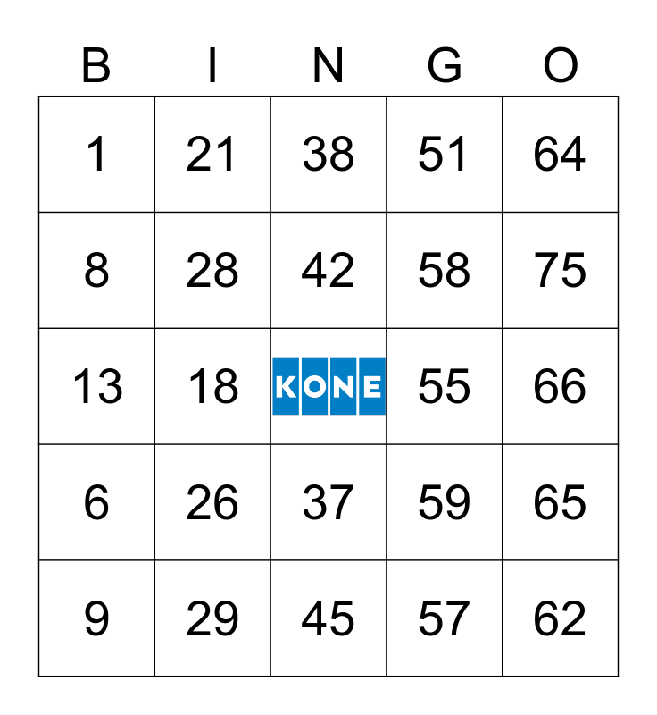 This bingo card has a free space and 24 words: 9, 26, 42, 57, 64, 1, 21, 38, 55, 66, 13, 28, 59, 65, 8, 29, 45, 51, 75, 6, 18, 37, 58 and 62.