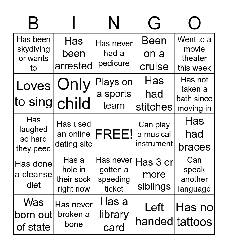This bingo card has a free space and 24 words: Has a hole in their sock right now, Has never broken a bone, Plays on a sports team, Was born out of state, Went to a movie theater this week, Has been skydiving or wants to, Loves to sing, Has been arrested, Can play a musical instrument, Has never gotten a speeding ticket, Has had stitches, Has laughed so hard they peed, Has 3 or more siblings, Can speak another language, Only child, Left handed, Has had braces, Has never had a pedicure, Has not taken a bath since moving in, Has used an online dating site, Has no tattoos, Has done a cleanse diet, Been on a cruise and Has a library card.