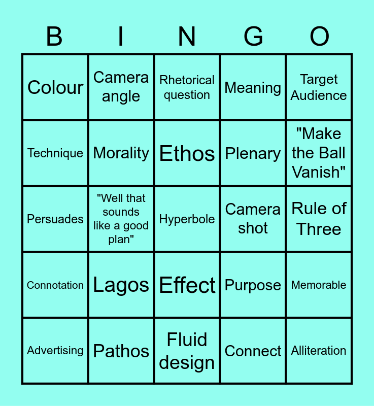 This bingo card has a free space and 24 words: Lagos, Pathos, Ethos, Advertising, Target Audience, Colour, Technique, Camera angle, Camera shot, Effect, Plenary, Persuades, Purpose, Memorable, Morality, Connect, Rule of Three, Rhetorical question, "Make the Ball Vanish", "Well that sounds like a good plan", Alliteration, Connotation, Meaning and Fluid design.