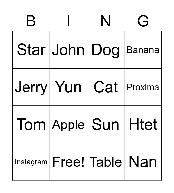 This bingo card has 25 words: Fifi, Dynamic, Proxima, Paimon, Jerry, Star, Yun, John, Free!, Jimmy, Tom, Sun, Moon, Mp, Cat, Faceboom, Table, Dog, Apple, Htet, Instagram, Chair, Nan, Banana and Hnin.