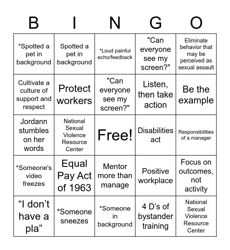 This bingo card has a free space and 67 words: Spotted a pet in background, Someone's video freezes, "Can everyone see my screen?", Focus on outcomes, not activity, Mentor more than manage, Youtube video, Spotted a pet in background, Someone's video freezes, "Can everyone see my screen?", Focus on outcomes, not activity, Mentor more than manage, Youtube video, Responsibilities of a manager, Eliminate behavior that may be perceived as sexual assault, Be the example, Cultivate a culture of support and respect, National Sexual Violence Resource Center, *Spotted a pet in background, Have a conversation, Listen, then take action, Equal Pay Act of 1963, *Someone's video freezes, "Can everyone see my screen?", 4 D’s of bystander training, Focus on outcomes, not activity, Mentor more than manage, *Plays youtube video, Responsibilities of a manager, Be the example, Cultivate a culture of support and respect, National Sexual Violence Resource Center, Motherhood penalty, “Next slide please”, Keep the conversation going, Zero tolerance policy, “I don’t have a pla”, Lead by example, Positive workplace, Jordann stumbles on her words, Empower people, Laws & Regulations, Protect workers, Disabilities act, Making employment decisions, *Someone takes a drink, *Someone is eating on screen, Develope & Publicize, *Someone sneezes, *Christmas tree in background, Be aware, *Loud painful echo/feedback, Informal discrimination, *Obviously playing on phone, Check in with employees, Get to know your coworker, *Someone in background, Overt racism, Covert racism, Stereotype, “Next slide, please”, Important to have a plan, Identify & Protect, *Ad plays before video, Bystander training, Over communicate, *Makes breakout room and Civil Rights Act of 1991.