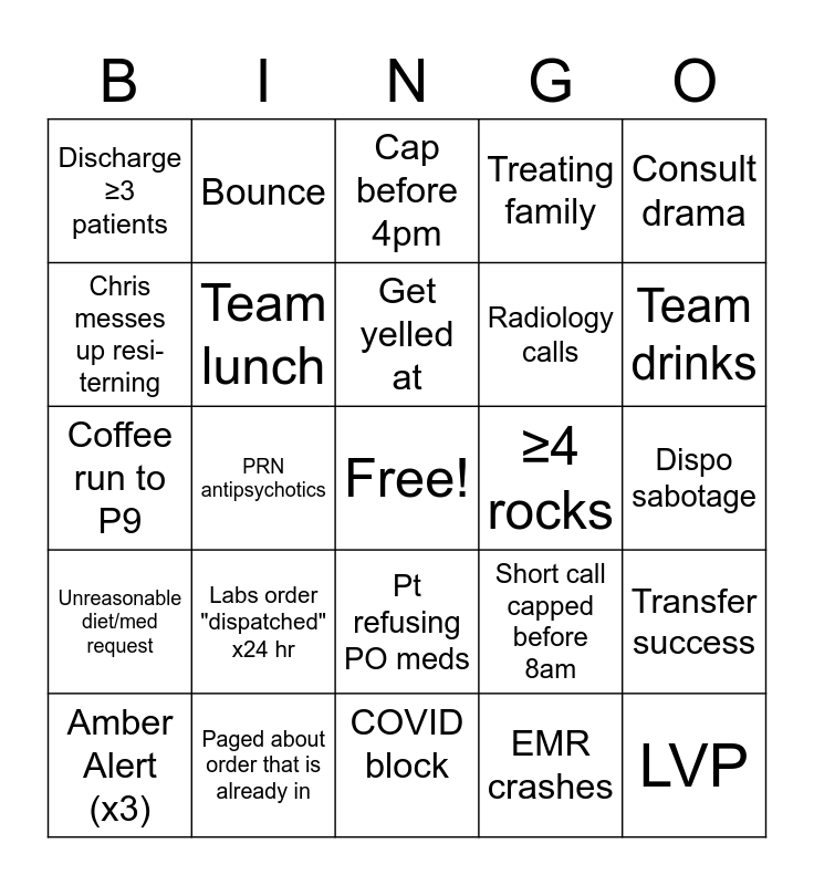 This bingo card has a free space and 24 words: Amber Alert (x3), Labs order "dispatched" x24 hr, Get yelled at, EMR crashes, Consult drama, Discharge ≥3 patients, Bounce, Cap before 4pm, ≥4 rocks, Dispo sabotage, Coffee run to P9, Team lunch, Short call capped before 8am, Transfer success, Chris messes up resi-terning, Paged about order that is already in, COVID block, Treating family, Team drinks, Unreasonable diet/med request, PRN antipsychotics, Pt refusing PO meds, Radiology calls and LVP.