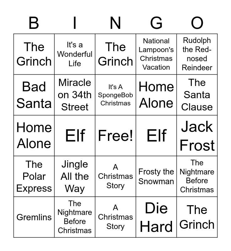 This bingo card has a free space and 34 words: National Lampoon's Christmas Vacation, Die Hard, Charlie Brown Christmas, Elf, The Polar Express, Miracle on 34th Street, Rudolph the Red-nosed Reindeer, Gremlins, It's a Wonderful Life, A Christmas Story, It's A SpongeBob Christmas, The Grinch, Bad Santa, National Lampoon's Christmas Vacation, Elf, The Santa Clause, The Nightmare Before Christmas, Home Alone, Jingle All the Way, Frosty the Snowman, A Christmas Story, Home Alone, The Grinch, Jack Frost, A Christmas Story, The Grinch, National Lampoon's Christmas Vacation, Die Hard, Home Alone, Bad Santa, The Santa Clause, Elf, The Nightmare Before Christmas and The Polar Express.