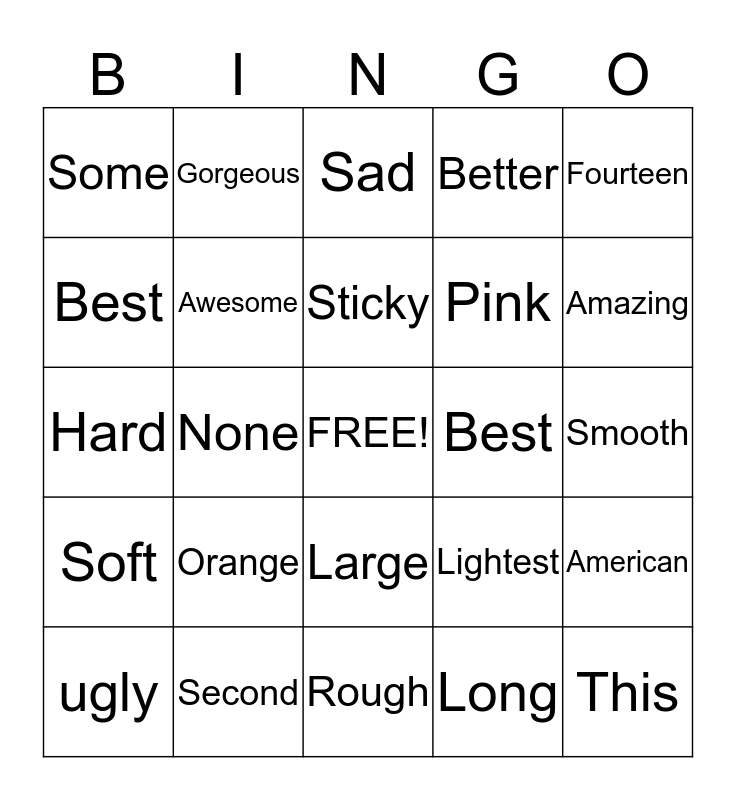 This bingo card has a free space and 24 words: Orange, Second, Sticky, ugly, Fourteen, Some, Best, Gorgeous, Best, Large, Pink, Hard, Lightest, American, Awesome, Long, Smooth, Sad, Amazing, None, This, Soft, Better and Rough.