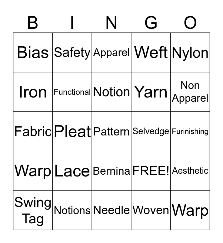 This bingo card has 25 words: Lace, Needle, Notion, Swing Tag, Nylon, Bias, Iron, Safety, Selvedge, Bernina, Yarn, Fabric, FREE!, Aesthetic, Functional, Warp, Furinishing, Apparel, Non Apparel, Pleat, Pattern, Notions, Warp, Weft and Woven.