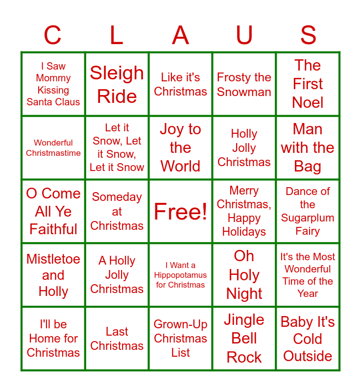 This bingo card has a free space and 50 words: All I Want for Christmas is You, Last Christmas, It's Beginning to Look a Lot Like Christmas, Jingle Bell Rock, It's the Most Wonderful Time of the Year, Underneath the Tree, Sleigh Ride, Feliz Navidad, Holly Jolly Christmas, Mistletoe, Wonderful Christmastime, Let it Snow, Let it Snow, Let it Snow, Oh Holy Night, Baby It's Cold Outside, You Make it Feel Like Christmas, Have Yourself a Merry Little Christmas, Like it's Christmas, Merry Christmas, Happy Holidays, White Christmas, I Saw Mommy Kissing Santa Claus, A Holly Jolly Christmas, Grown-Up Christmas List, Frosty the Snowman, Man with the Bag, The Christmas Song, Bring Me Love, Joy to the World, Do You Hear What I Hear?, The First Noel, Mistletoe and Holly, Rudolph the Red-Nosed Reindeer, One More Sleep, What Christmas Means to Me, Here Comes Santa Claus, Run Rudolph Run, Blue Christmas, Winter Wonderland, Believe, Little Drummer Boy, O Come All Ye Faithful, Mary, Did You Know?, Rockin Around the Christmas Tree, Carol of the Bells, You're a Mean One, Mr. Grinch, I'll be Home for Christmas, Someday at Christmas, I Want a Hippopotamus for Christmas, Santa Baby, Dance of the Sugarplum Fairy and Santa Claus is Coming to Town.