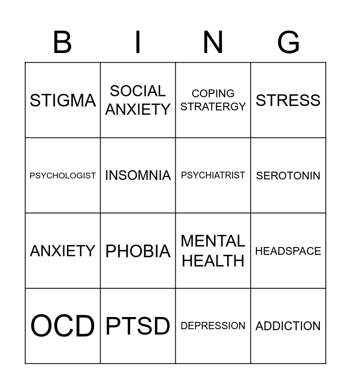 This bingo card has 16 words: PTSD, HEADSPACE, COPING STRATERGY, STIGMA, ANXIETY, SOCIAL ANXIETY, MENTAL HEALTH, DEPRESSION, PSYCHOLOGIST, INSOMNIA, OCD, STRESS, PHOBIA, SEROTONIN, PSYCHIATRIST and ADDICTION.