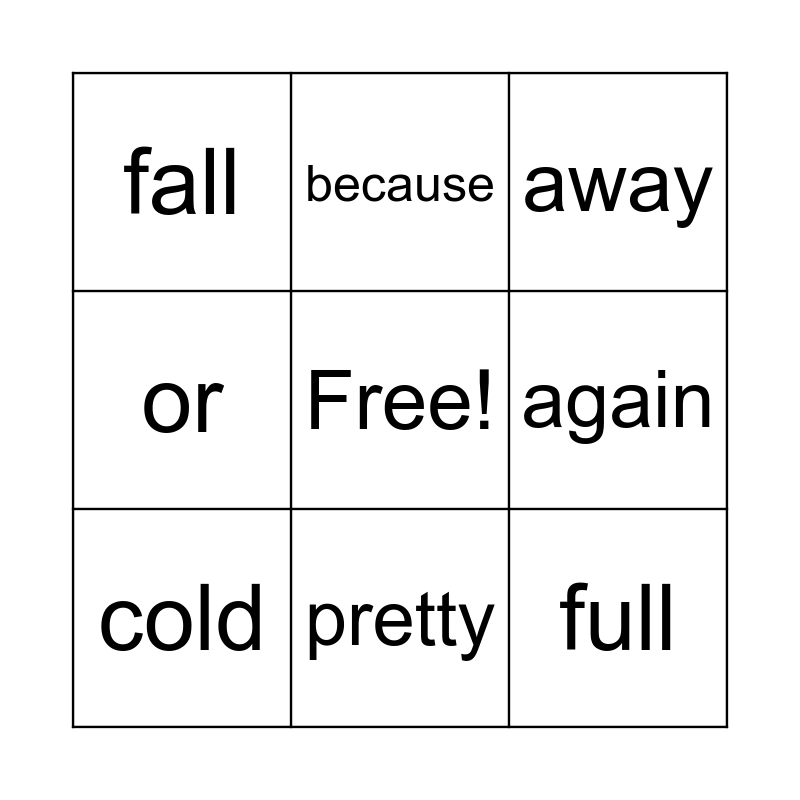 This bingo card has a free space and 8 words: again, away, because, cold, fall, full, or and pretty.