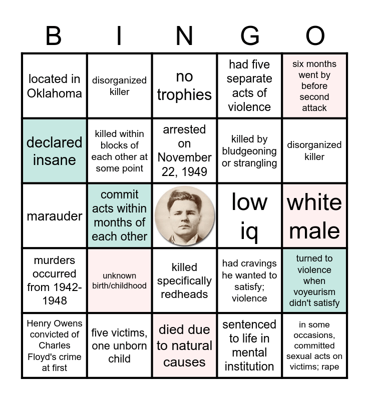 This bingo card has a free space and 24 words: unknown birth/childhood, five victims, one unborn child, arrested on November 22, 1949, Henry Owens convicted of Charles Floyd's crime at first, six months went by before second attack, located in Oklahoma, declared insane, disorganized killer, low iq, killed specifically redheads, killed by bludgeoning or strangling, marauder, had cravings he wanted to satisfy; violence, turned to violence when voyeurism didn't satisfy, killed within blocks of each other at some point, sentenced to life in mental institution, white male, no trophies, disorganized killer, commit acts within months of each other, in some occasions, committed sexual acts on victims; rape, murders occurred from 1942-1948, had five separate acts of violence and died due to natural causes.