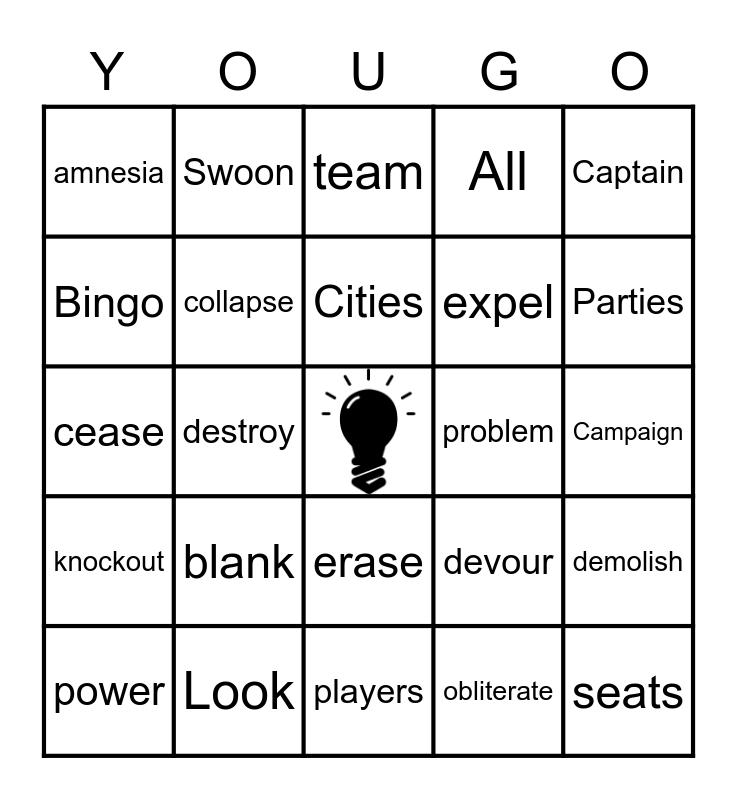 This bingo card has a free space and 80 words: Together, table, team, time, total, trance, unconsciousness, Volunteers, wipeout, words, Workers, zap, All, amnesia, Behaviors, Bingo, black, blank, Bowl, Campaign, cancel, Captain, cease, Cities, collapse, coma, Commit, consume, Covid, outside, Parties, play, players, point, power, problem, Production, pulverize, rules, seats, Service, shutdown, sleep, slumber, States, Swoon, cut, cutoff, dark, Defense, demolish, destroy, devour, dissolve, eclipse, Efforts, eject, end, eradicate, erase, expel, expunge, exterminate, faint, Forces, friends, game, Help, incomplete, Issues, knockout, Look, loss, Move, narcosis, night, obliterate, oblivion, Once and outage.