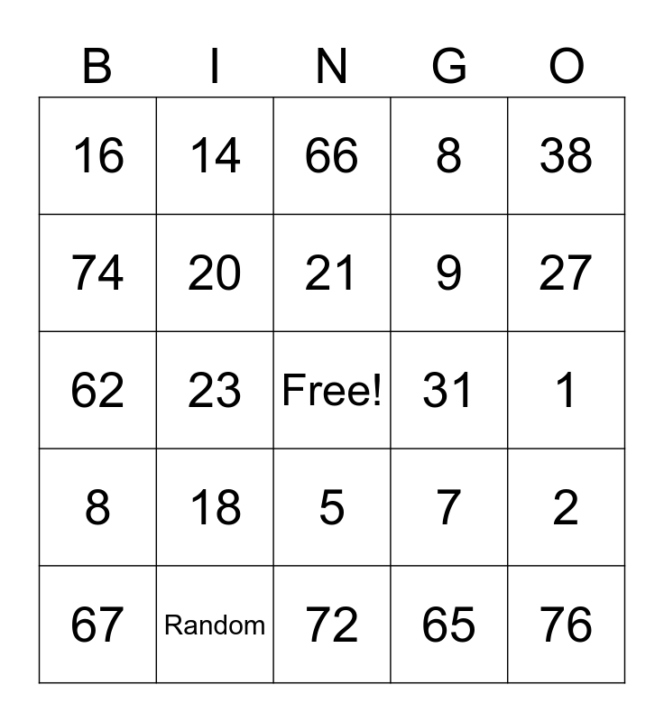 This bingo card has a free space and 24 words: 18, Random, 21, 67, 38, 16, 74, 14, 31, 5, 9, 62, 7, 2, 20, 65, 1, 66, 27, 23, 76, 8, 8 and 72.